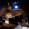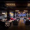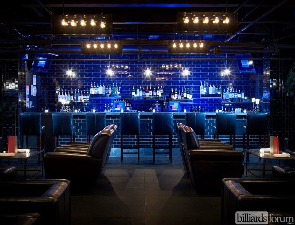 The interior features a color palette of fiery reds and cool grays accented with chrome and the requisite black. From the high-tech sound system, the DJ wafts a variety of tunes throughout the space, gently during dinner time, increasing in volume as the hour gets later. A 100 seat bar snakes its way along the edge of the billiard hall, its glass top undulating with a swirl of changing colors. The 60 seat dining room overlooks the billiard area, adding just enough of a "spectator sport" element to the eating ritual, yet is set off far enough away to create a peaceful oasis for diners.