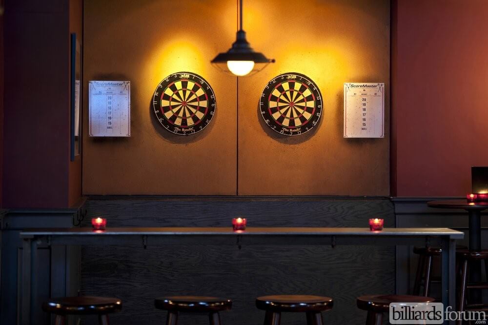 A staged photo showing a couple playing darts at Society Billiards in New York, NY.