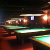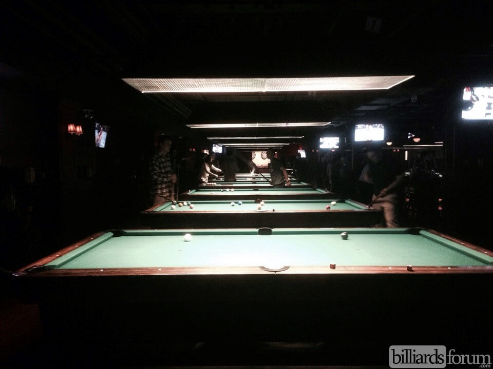 Looking into the billiards area inside of Society Billiards in New York, NY.