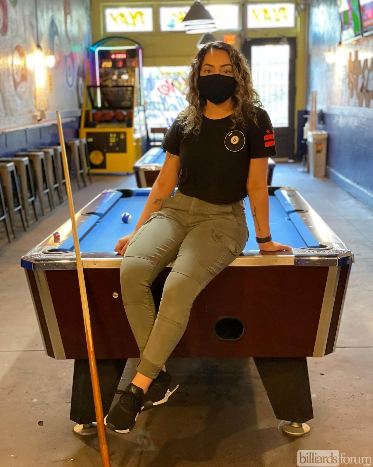 An employee at the Toro Bar in Washington, DC. Shown here sitting on the edge of a pool table.