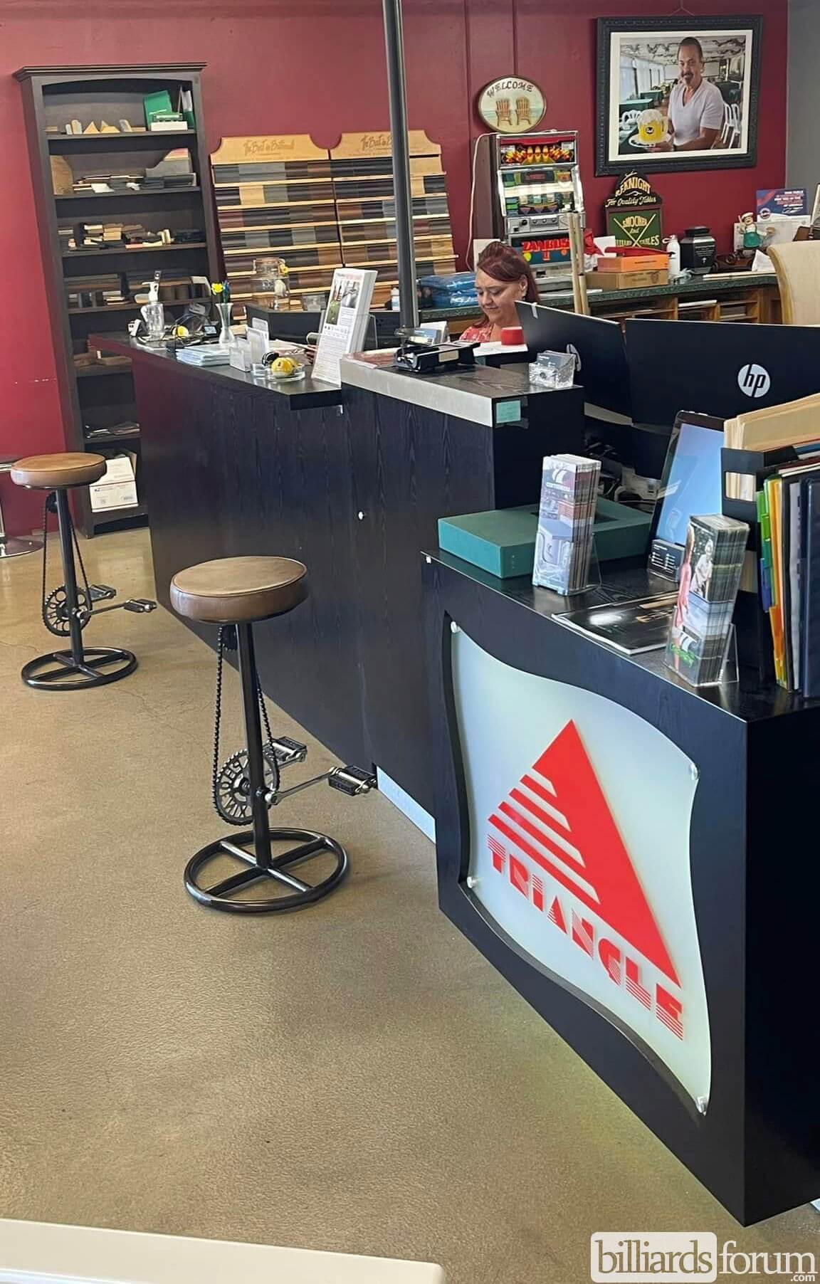The front desk at Triangle Billiards & Bar Stools, a Tustin, CA billiard retailer.