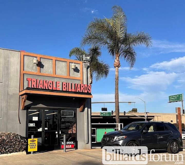 The store front of Triangle Billiards & Bar Stools, a Tustin, CA billiard supply company.