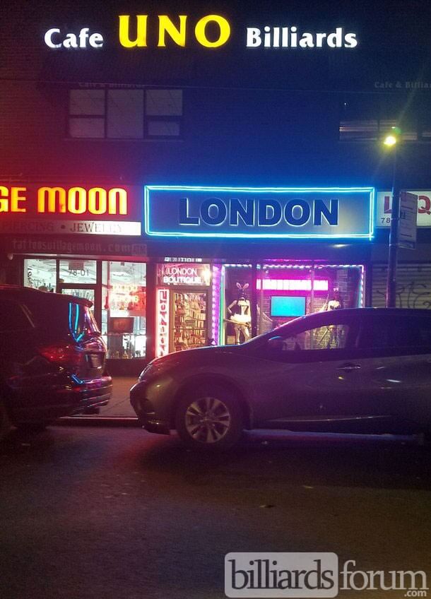 Photo of the Uno Cafe & Billiards pool hall in Jackson Heights, New York.