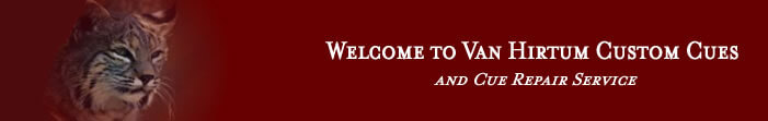 Van Hirtum Custom Cues and Bob Cat Cues specialize in high quality handcrafted cues to one of a kind pool cues. Custom-made two-piece cues are built to our exacting specifications. Collectible, hand made cues for pocket billiards built by a custom cue maker with high standards and integrity.