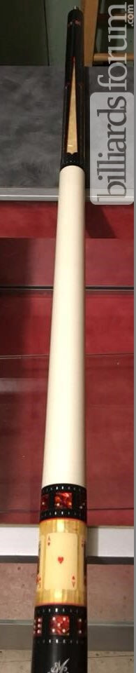 A BMC Casino 1 Hearts cue that was for sale in August of 2019. From the seller: This cue is a 19oz Casino 1 BMC cue with hearts cards and red dice. It is signed by Robert Meucci and dated 7-3-09 on the forearm. It comes with joint protectors. The cue is brand new and has never been chalked. What a beautiful BMC cue this is.