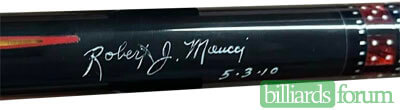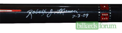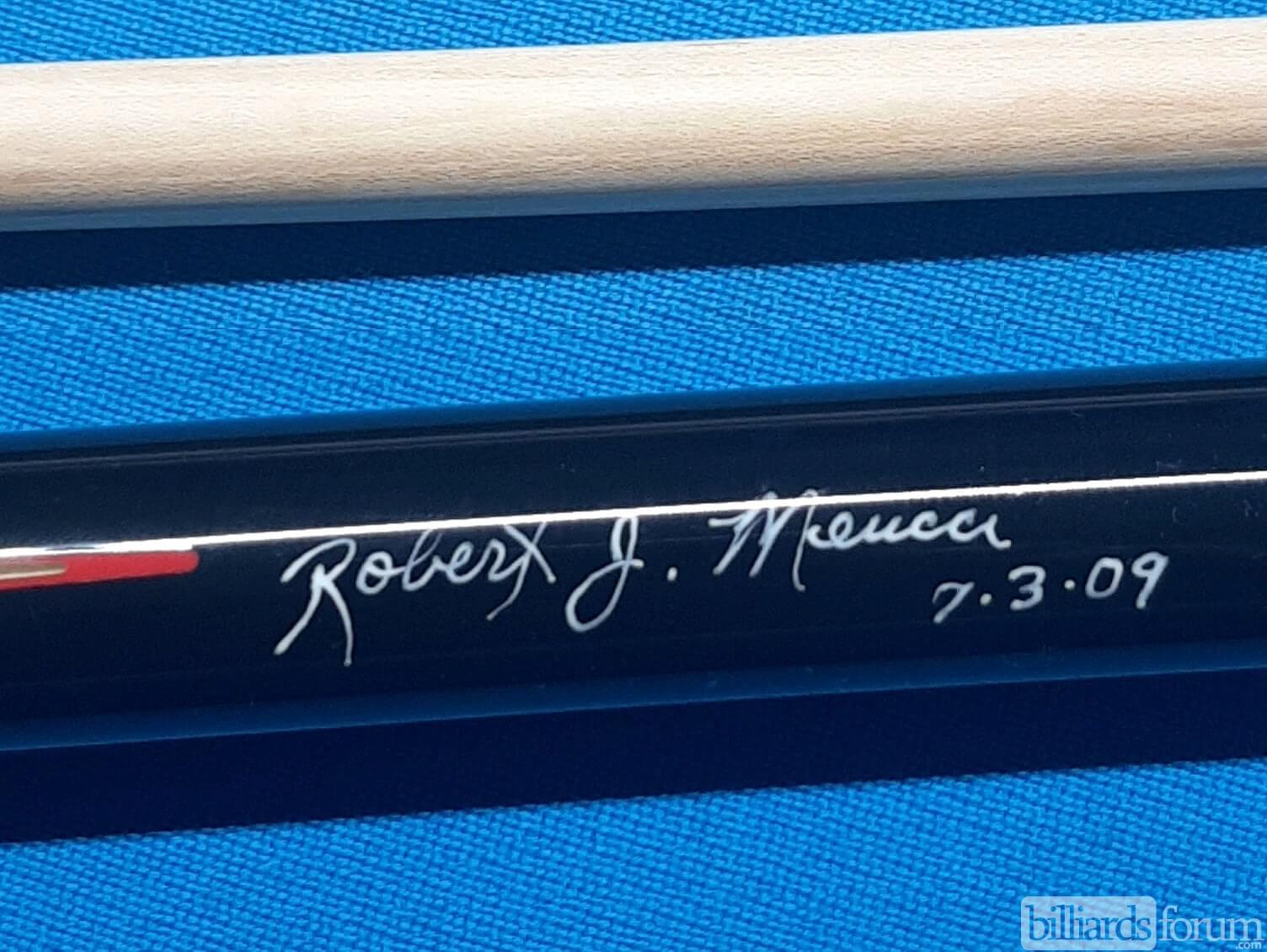 This BMC Casino 1 Hearts cue stick has the signature "Robert J. Meucci" on the forearm.