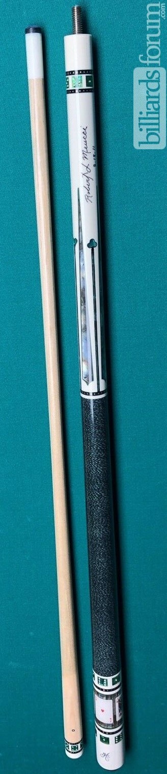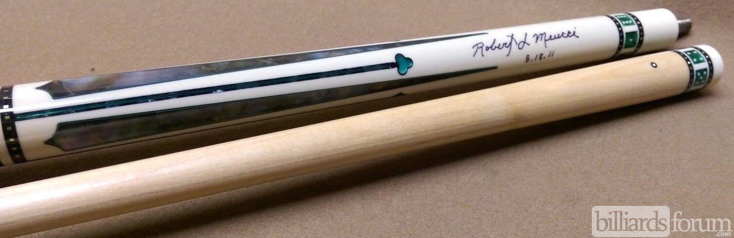 A BMC Casino 2 Hearts pool cue that was for sale in the past. This one is signed by Bob Meucci and dated 2010-02-25.