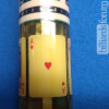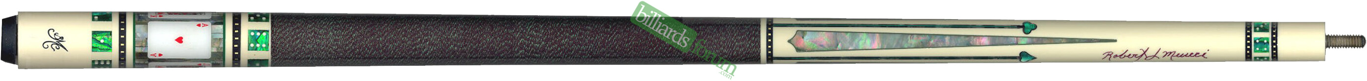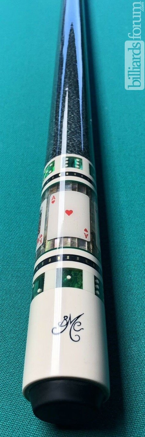 A BMC Original Casino 2 limited edition pool cue that was for sale on eBay in 2018. From the seller: Meucci BMC Casino 2 rare pool cue with Meucci Black Dot shaft. Black mother of pearl butt-sleeve featuring a royal flush in the hearts card suit with green mirrored framing with green paua-shell dice set at the cue sleeve and forearm collar. This cue was crafted by Bob Meucci to showcase the unique designs created by the Billiards Legend himself! The cue is signed and dated 2011-08-18 by Robert J. Meucci.