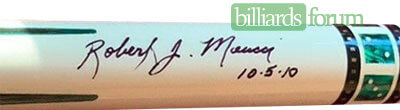 Photo of the forearm of a BMC Casino 2 Hearts pool cue, showing the signature of Bob Meucci as well as the completion date, 2009-06-18.