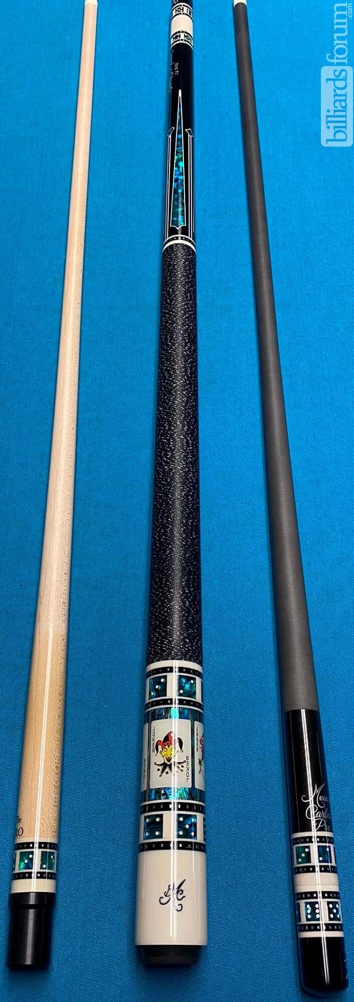 For sale is a BMC Casino 3 cue, all jokers, signed and dated by Robert Meucci. It includes a matching 29" Meucci The Pro shaft and a matching 30" Carbon Fiber Pro shaft.