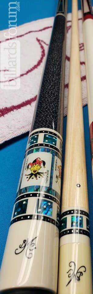 A BMC "Jokers" Casino 3 Cue that was shared in Jan 2022. From the owner: My Bob Meucci Custom Casino 3 showed up yesterday. I got to play with it today and it’s amazing! I got two 30” shafts. One pro and one carbon fiber pro. I got Kamui Clear tips for both shafts and matching joint protectors and an unwrapped cloth. It’s amazing! The work on it is nothing shy of phenomenal!