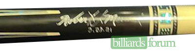 Photo of a BMC Casino 3 Joker pool cue. Signed and dated on the forearm.