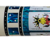 | Butt Sleeve: | The butt-sleeve consists of a 4 card hand in the joker suit, laid over a 48 piece blue paua shell sleeve trimmed with white on either side. Above and below this card sleeve are 6 bright blue paua shell dice with white numbering bordered on either side by 24 1/32 x 1/16 silver rectangles. All is set in a white background. The dice are surrounded by imitation ivory. The 5 inch lines on the forearm butt up against 24 silver 1/16 x 1/32 rectangles just above the wrap surrounded in black. |