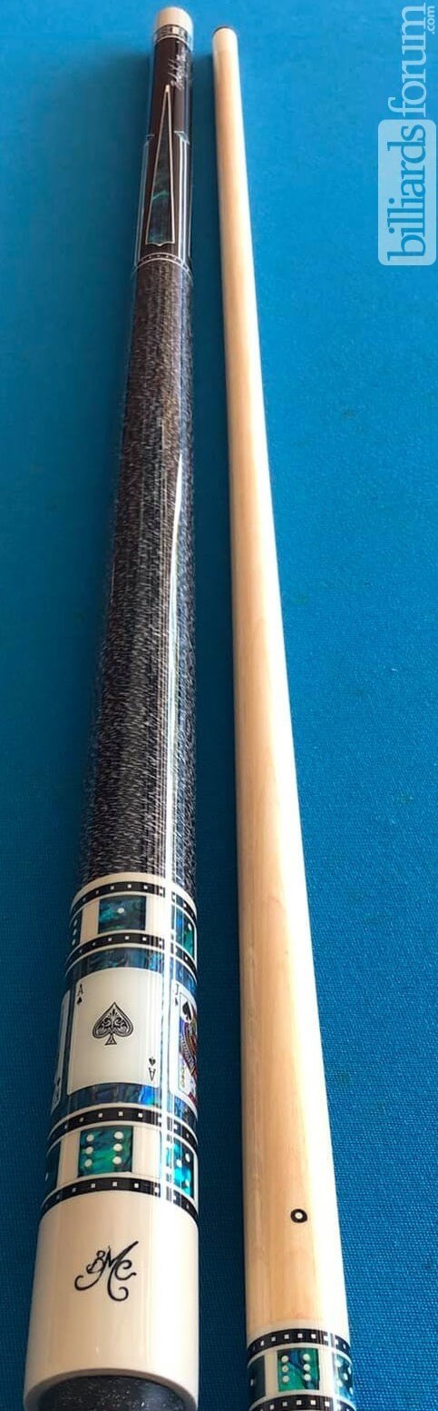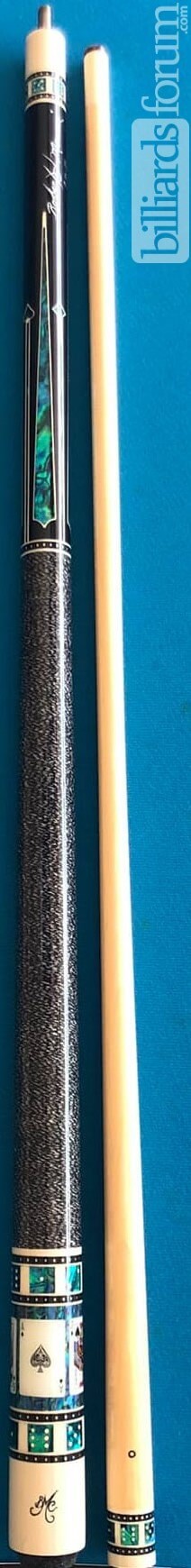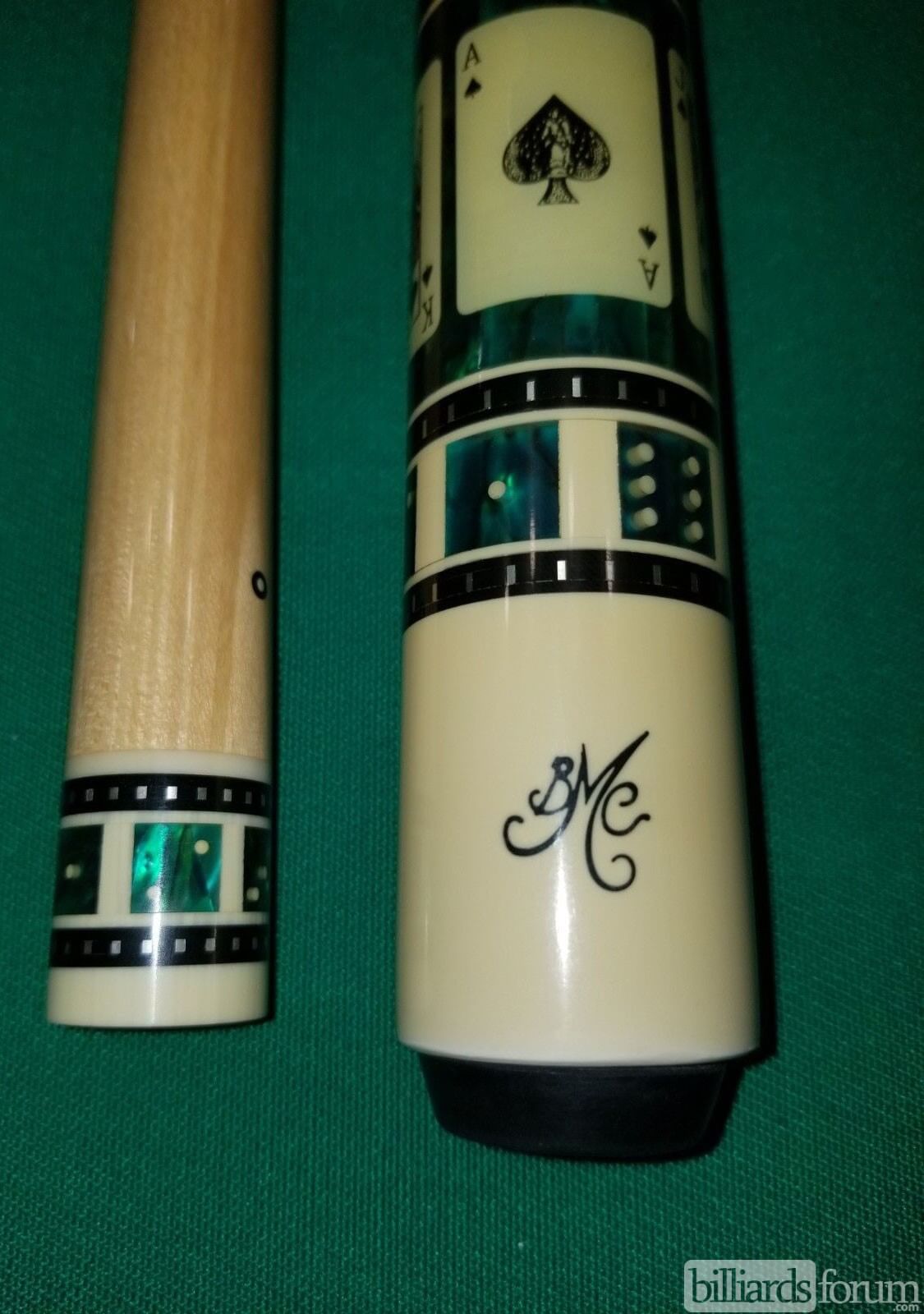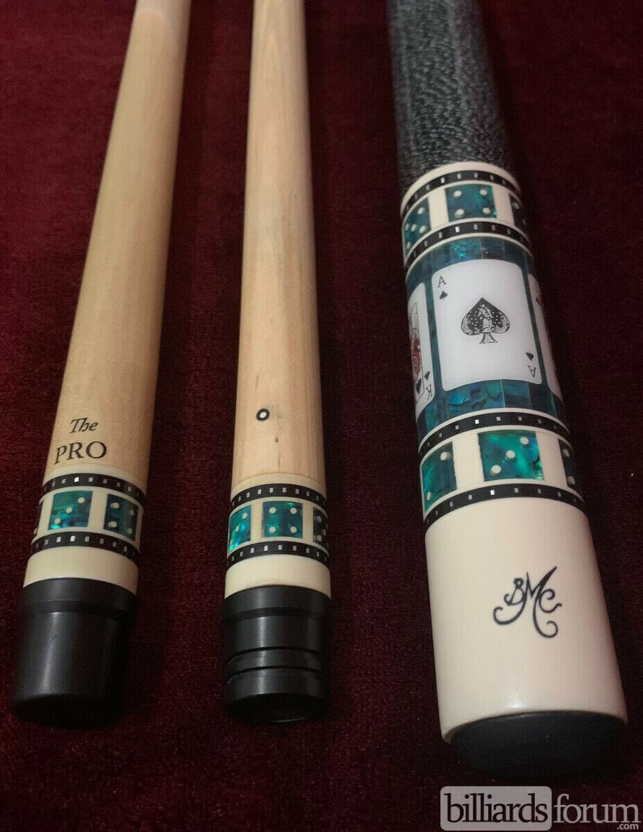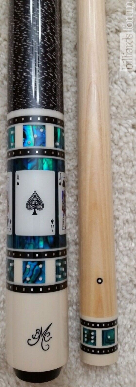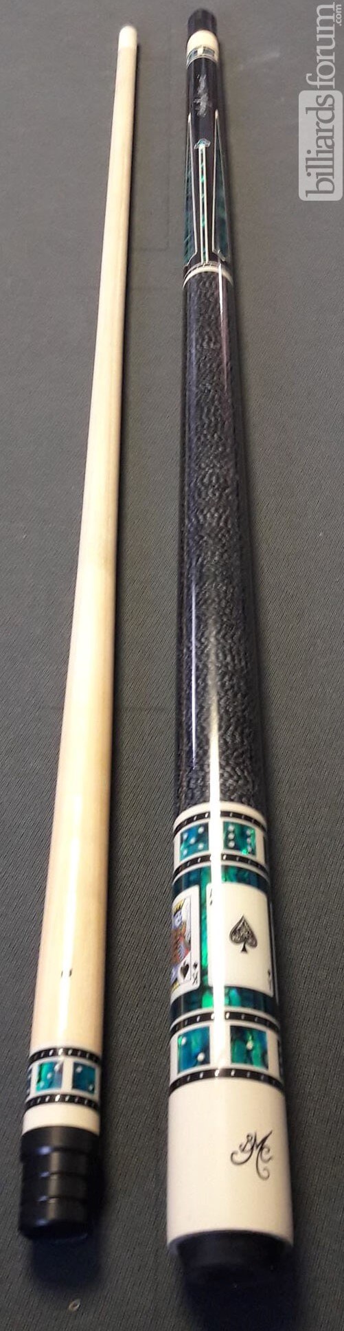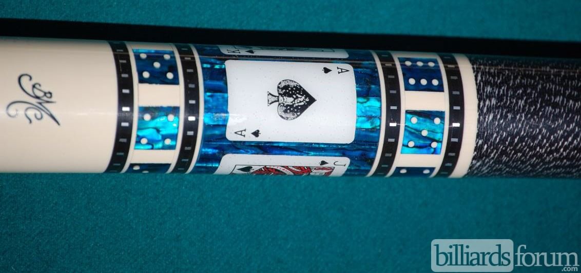 A photo from PoolDawg of the BMC Casino Cue #3 Spades version. The BMC Casino 3 Spades model pool cue is part of the BMC Casino Series line of pool cues. Though you can't see it in this picture, each forearm is signed Robert Meucci, and most are also dated.