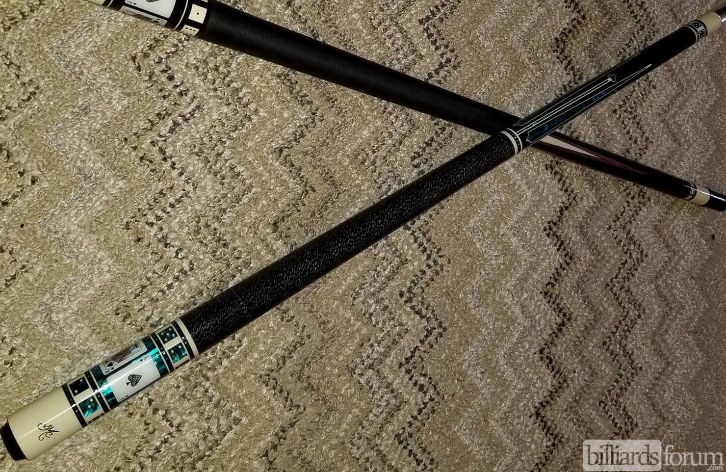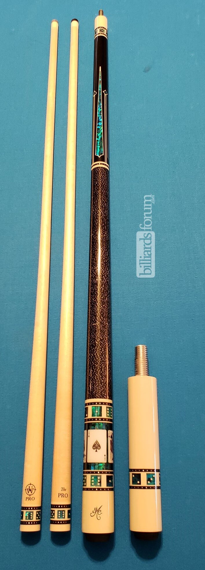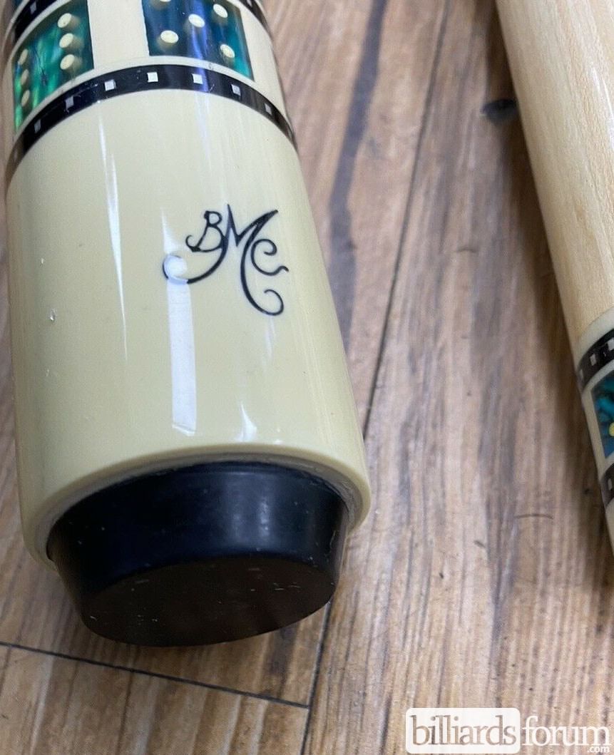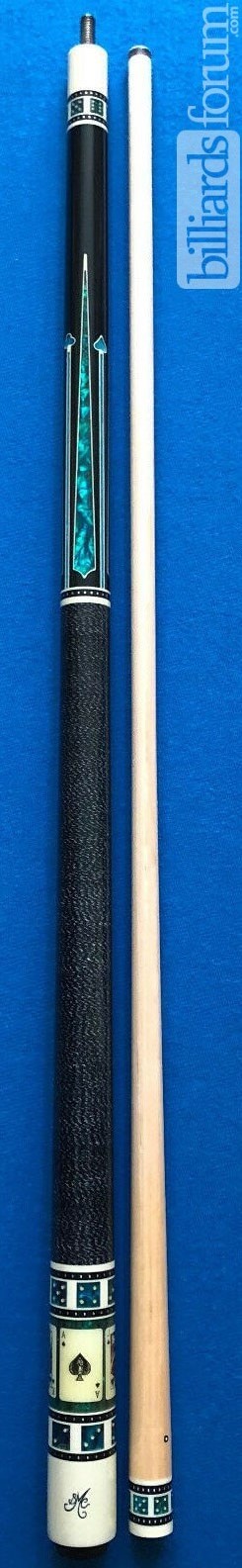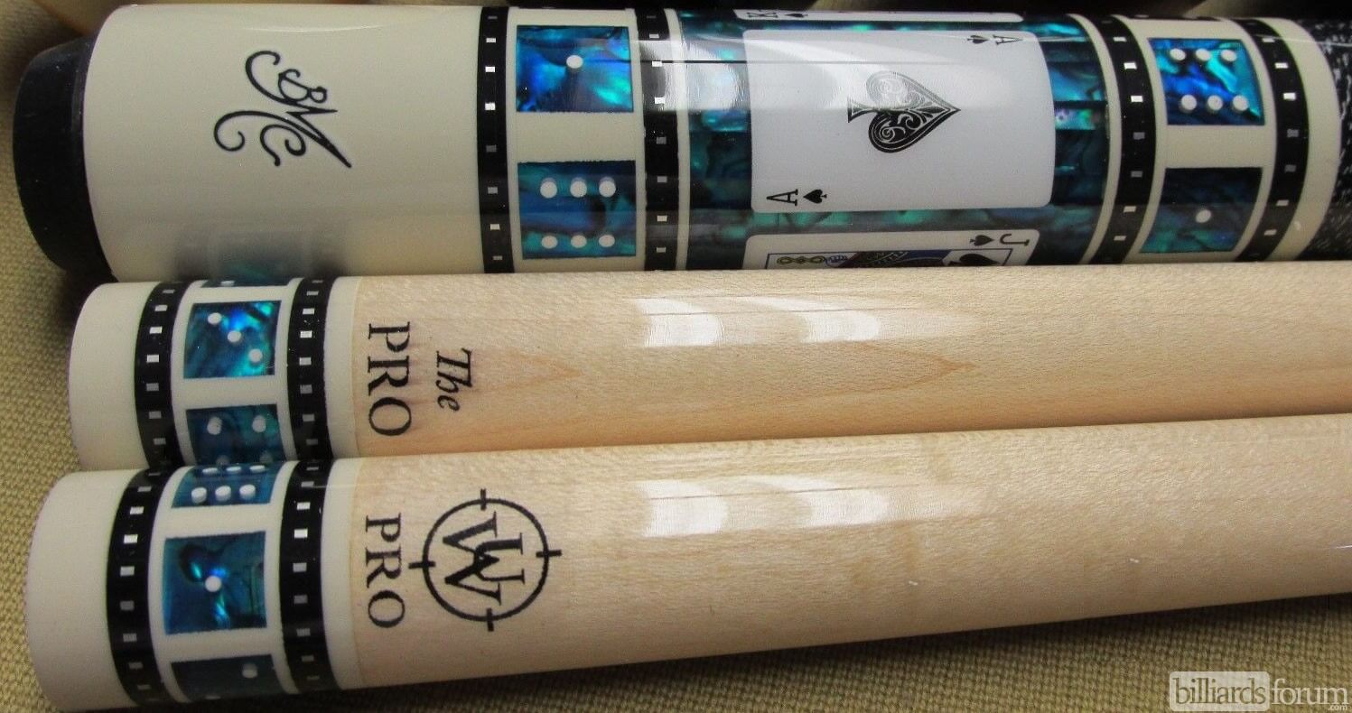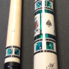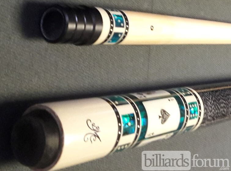 A photo from PoolDawg of the BMC Casino Cue #3 Spades version. The BMC Casino 3 Spades model pool cue is part of the BMC Casino Series line of pool cues. Though you can't see it in this picture, each forearm is signed Robert Meucci, and most are also dated.