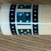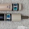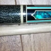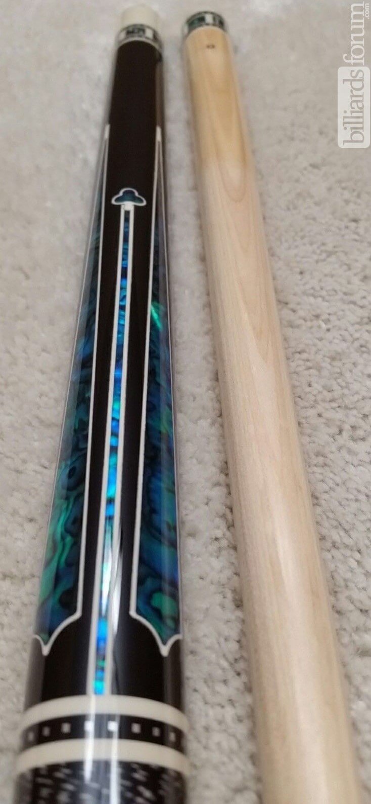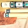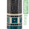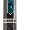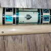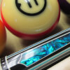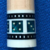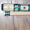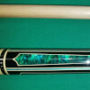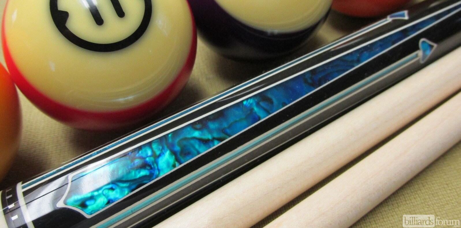 Photo of a BMC Casino 3 Spades pool cue showing the blue paua shell inlays designed to look like points.
