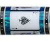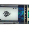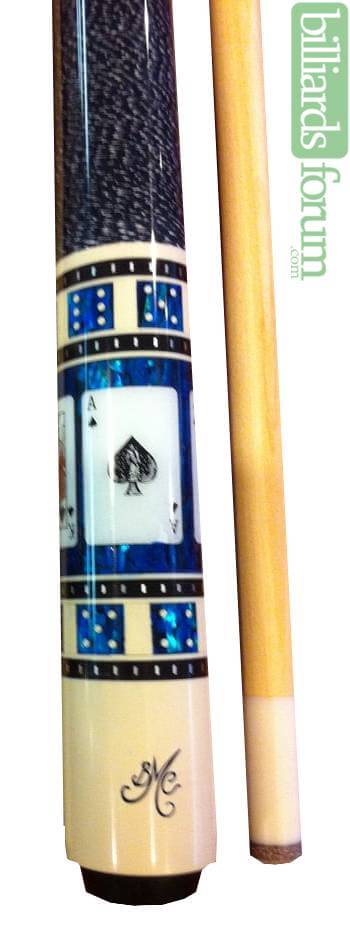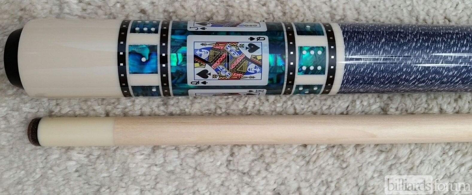 Photo of a BMC Casino 3 Spades pool cue. Cards are set in a blue paua-shell sleeve backdrop.