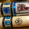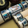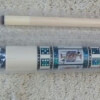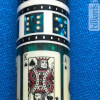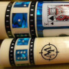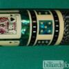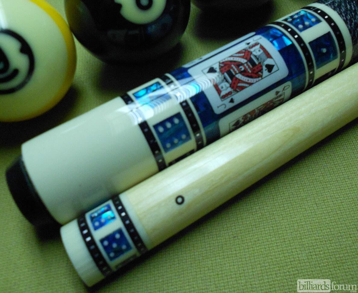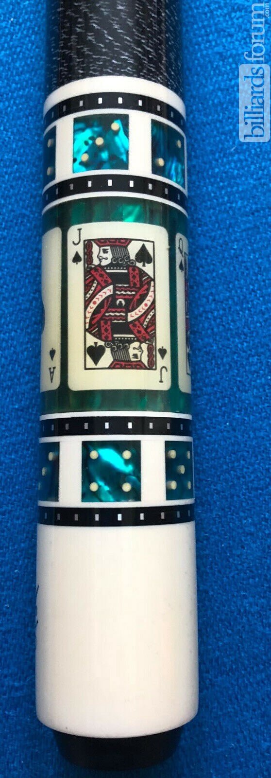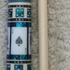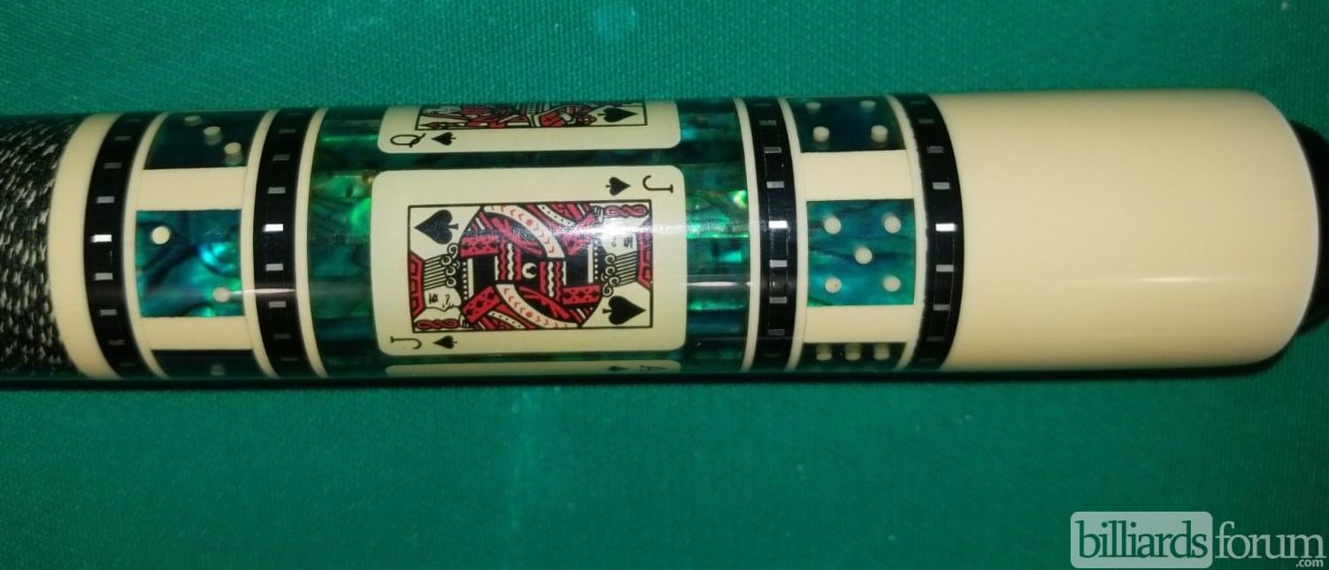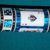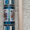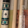Photo of a BMC Casino 3 Spades pool cue. Shown here is a close-up of the spades cards in the butt sleeve.
