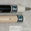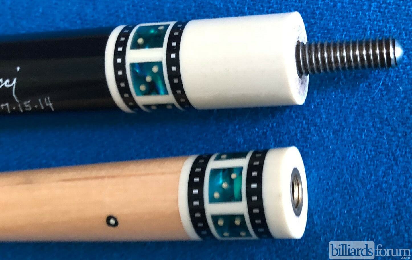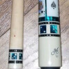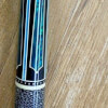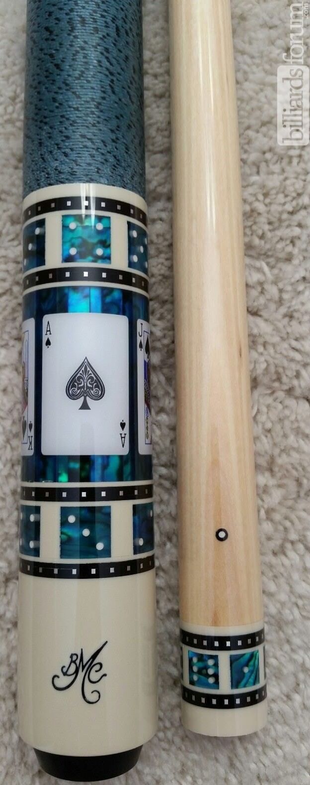 Photo of a BMC Casino 3 Spades pool cue showing the matching bright blue paua dice in the joint and shaft collars.