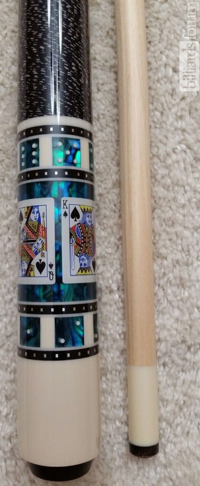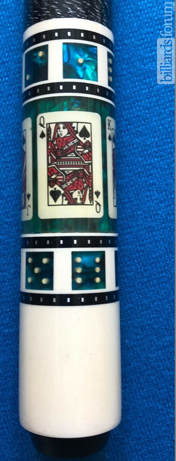A BMC Casino 3 Spades Pool Cue that was up for retail sale in the past on eBay by Meucci dealer Cue & Barrel in Auburn, KY. From the seller: This beautiful cue can be custom ordered for you at your specifications in approx 4 weeks time if not already in stock with either the Meucci "UW" Ultimate Weapon shaft, the Meucci Black Dot shaft, a Meucci Red Dot Shaft or a Meucci Classic No-Dot shaft (or any combination of the three you'd wish to purchase). It will be straight in every way and absolutely gorgeous! It will be a wonderful addition to any collection! Please look at the photos and zoom in to see how pretty this Spades BMC Casino-3 cue really is. So, so pretty!