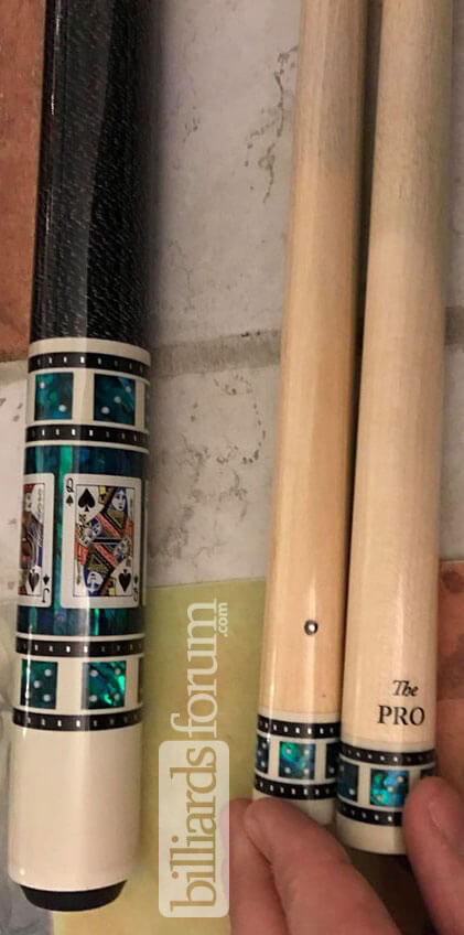A BMC Casino 3 Spades pool cue butt that was for sale in the past. The sale was for the butt only (no shaft). From the seller: I have a Meucci Casino 3 cue butt in good used shape. No shaft is included. The butt is straight. It has some scratches and a few light nicks. The bottom looks to be yellowing a bit and has a few scuffs.