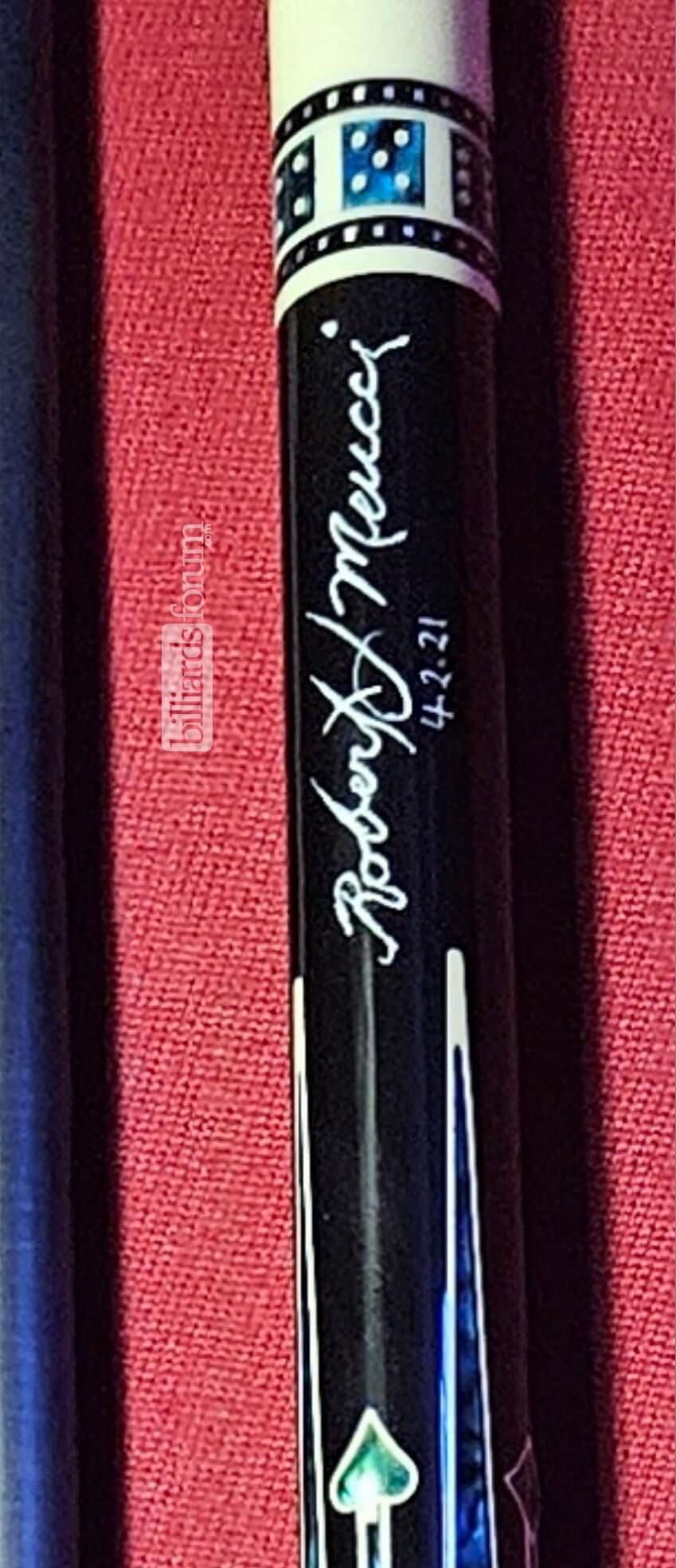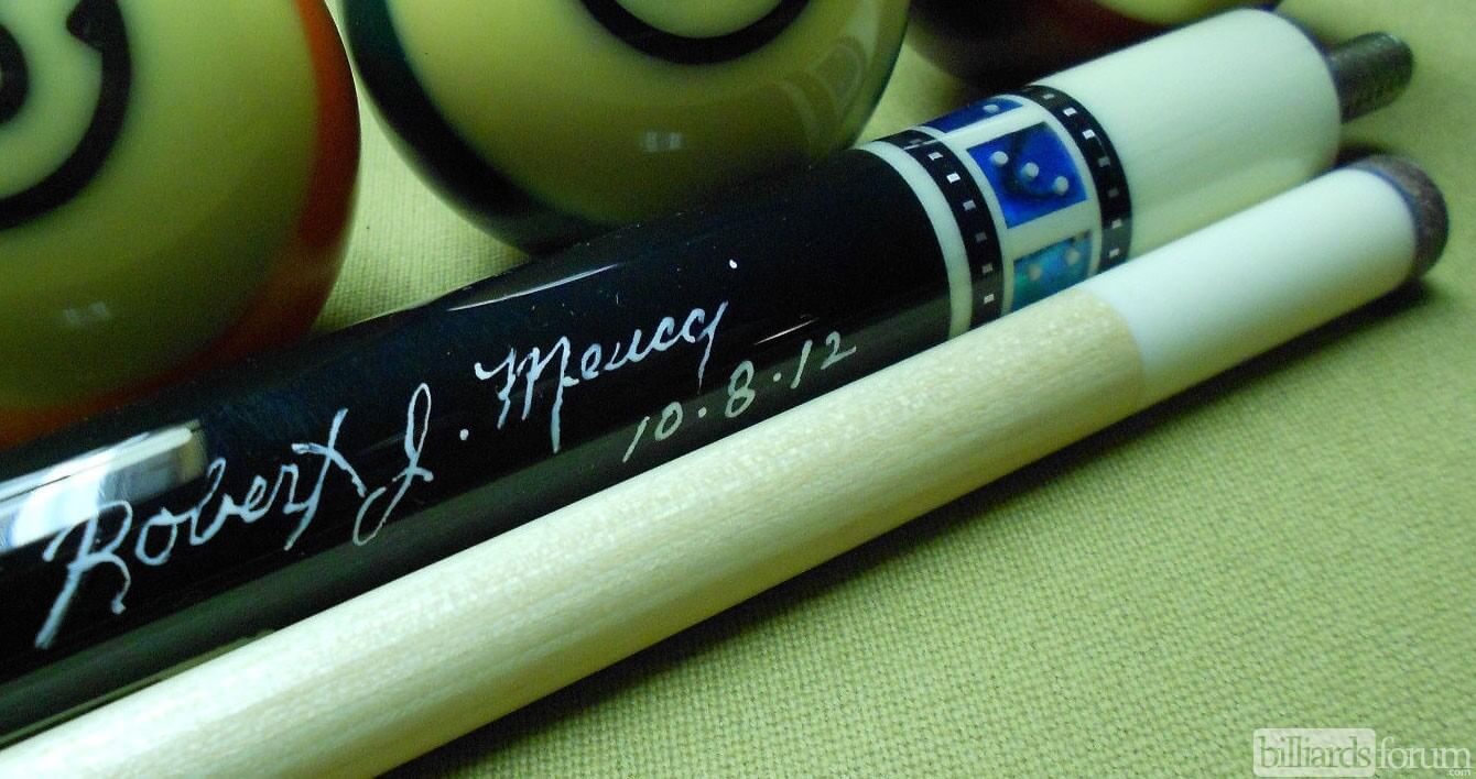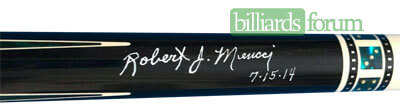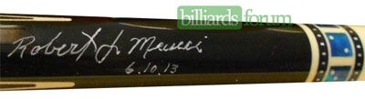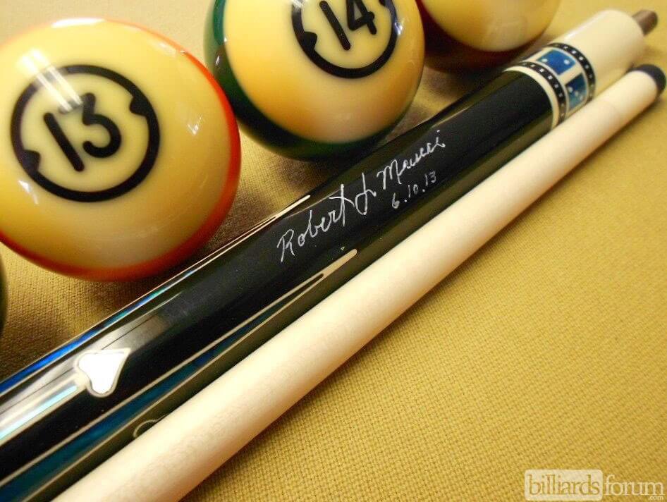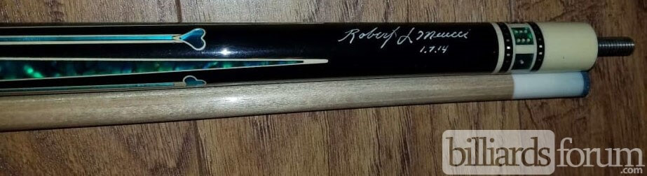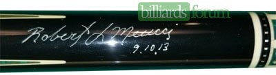 A signed and dated BMC Casino 3 Spades pool cue that was for sale on AZBilliards in the fall of 2013.