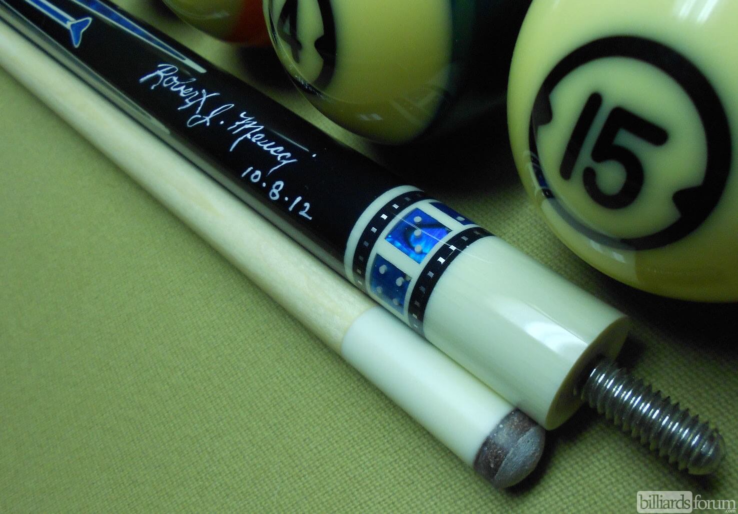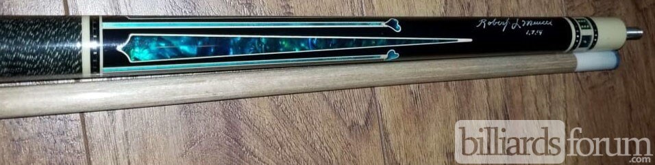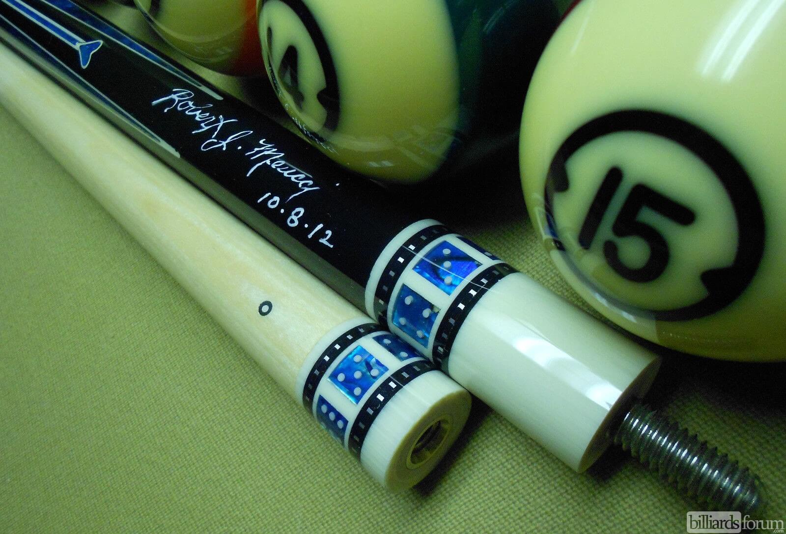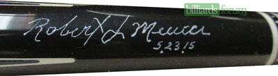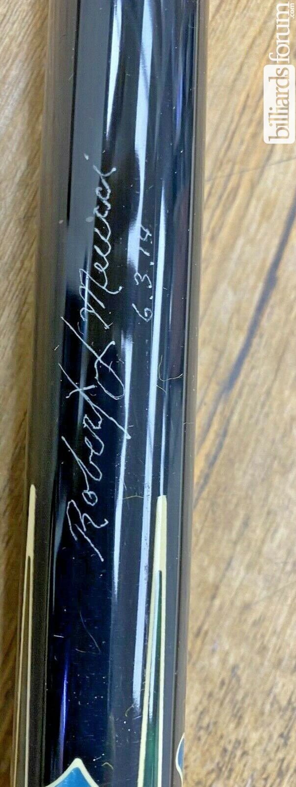 A signed and dated BMC Casino 3 Spades pool cue that was for sale on AZBilliards in the fall of 2013.