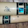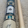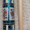 This BMC Casino 3 Spades cue stick is signed and dated by Bob Meucci and features bright blue paua dice and a royal flush of spades cards in the butt sleeve.