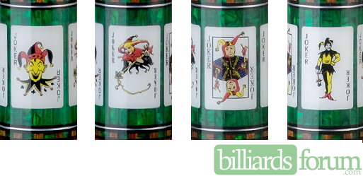 Shows the variety of joker cards in the BMC Casino 7 Joker pool cue.