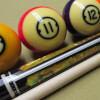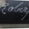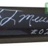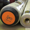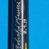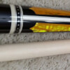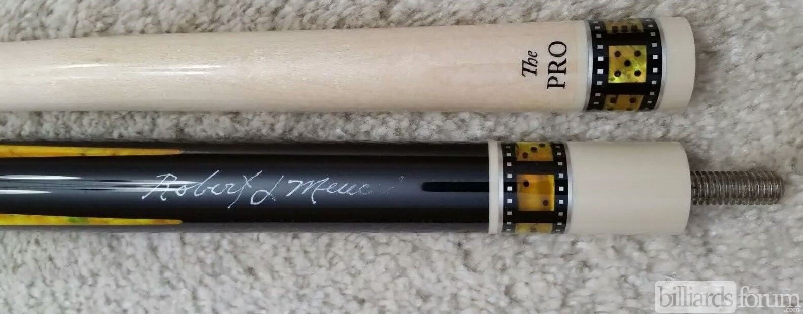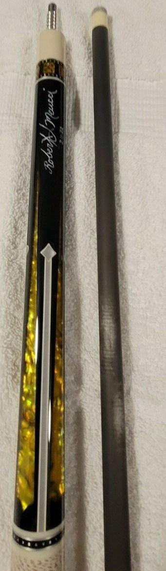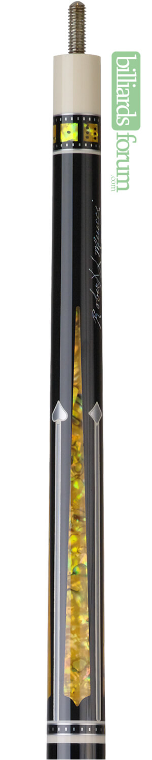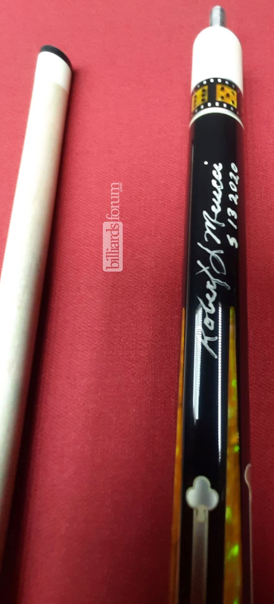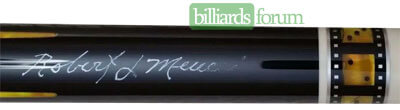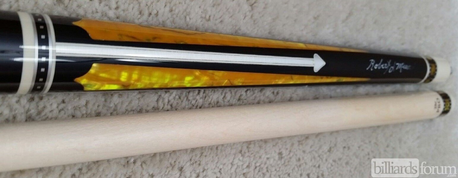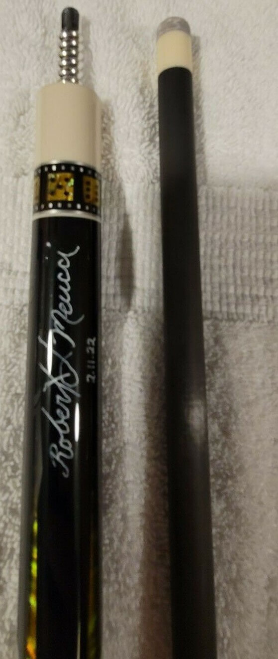 Photo showing the "Robert J. Meucci" signature and the number #12 on the forearm of a yellow and black BMC Casino 8 Spades pool cue stick.
