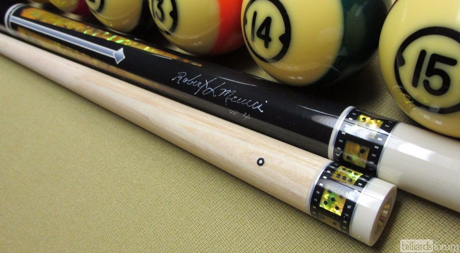 Photo of a BMC Casino 8 Spades pool cue showing the signed and numbered forearm: "Robert J. Meucci #04"