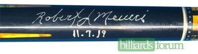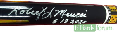 This 2017-2018 BMC Casino 8 pool cue features a signature of "Robert J. Meucci" aka Bob Meucci.