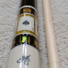 Photo of a BMC Casino 8 Spades pool cue showing the yellow paua-shell forearm inlaid points.