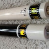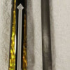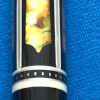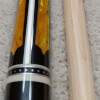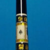 Photo of a BMC Casino 8 Spades pool cue showing the yellow paua shell inlays in the black phenolic forearm.