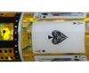 This BMC Casino #8 Spades pool cue features yellow dice and points on a black background. The BMC Casino 8 "Spades" model pool cue features an Ace, King, Queen, and Jack all in the suite of Spades in the butt sleeve.