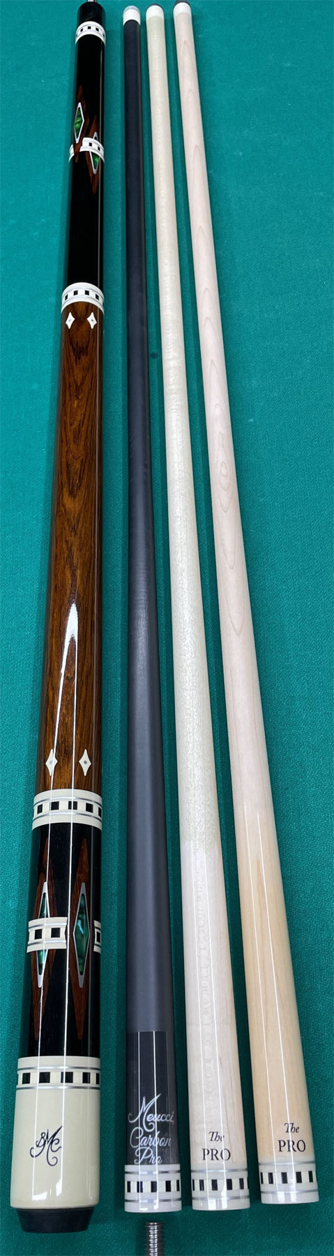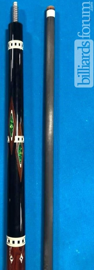 I own this cue. It is the sister cue to the one made for Corey Deuel. It has mother of pearl in the grip and green in the diamonds. Mine was made from the same piece of ebony and cocobolo as was Corey Deuel's.