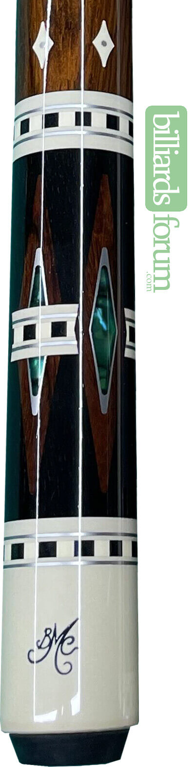 Buttsleeve of the BMC Corey Deuel Diamond cue with green inlay.
