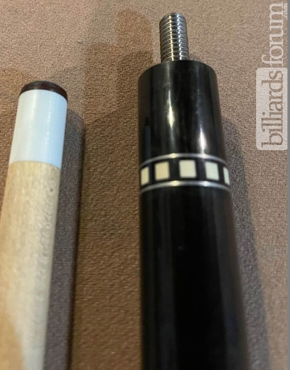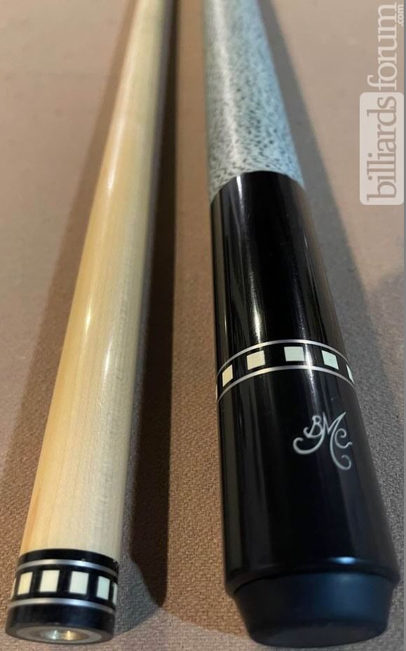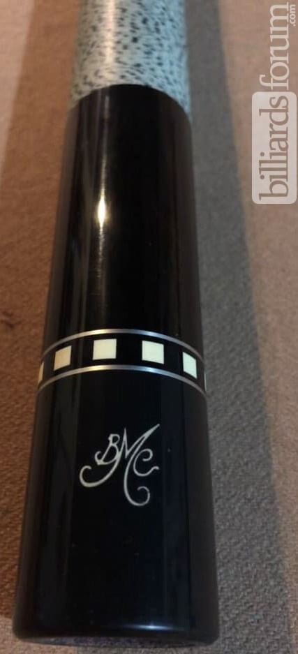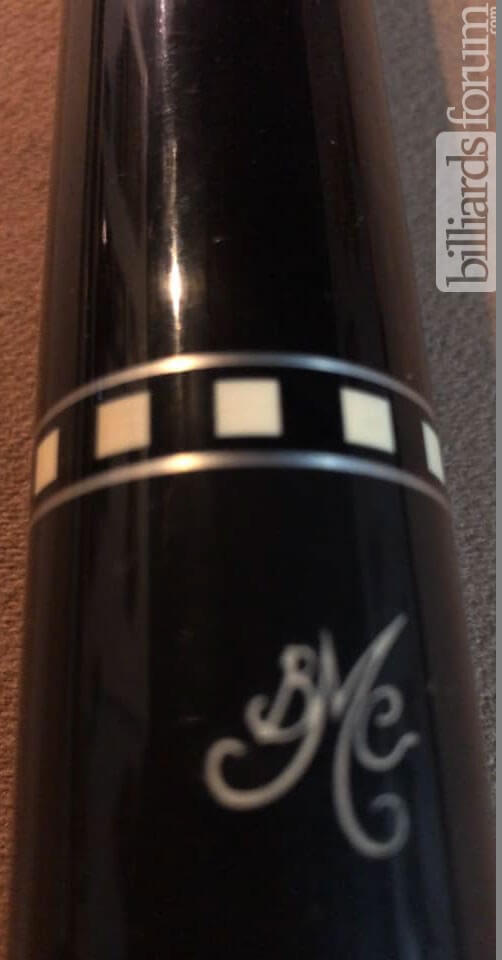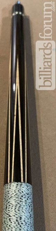 Photos of a custom ebony BMC cue that was originally made for Kevin Cheng. It was shown off in Oct 2020 from it's then-owner, Mr. Siene. He later posted it for sale in Jan 2021. From the seller: Nice Meucci BMC custom cue made for Kevin Cheng. This cue is in great shape but does have some play wear light scratch and a few dings. The cue is not perfect but is very presentable and obviously playable. It has a White and black speck exposed wrap. The cue has it's original matching shaft that is in perfect condition. It rolls true. The butt perfectly straight. Please don’t hesitate if you need additional pics or info. Trades possible. This is a high grade cue please only serious offers.