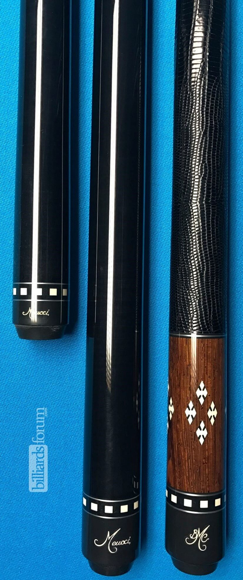 Photo of a custom ordered set of cues from Meucci and BMC in 2016. The playing cue is a BMC custom cue, and the there are matching jump and break cues by Meucci with matching trim rings.