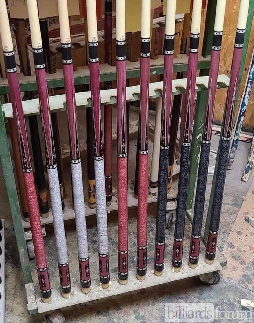 Photo from 2020-08-12 of the almost-complete new BMC 2020 model cues made exclusively for sale through Jonathan Stafford and Chris Binder.