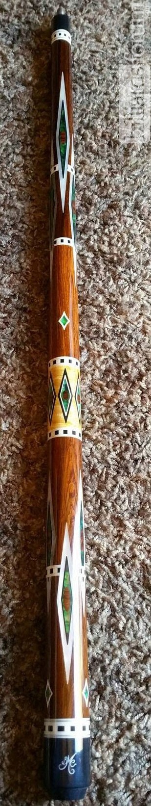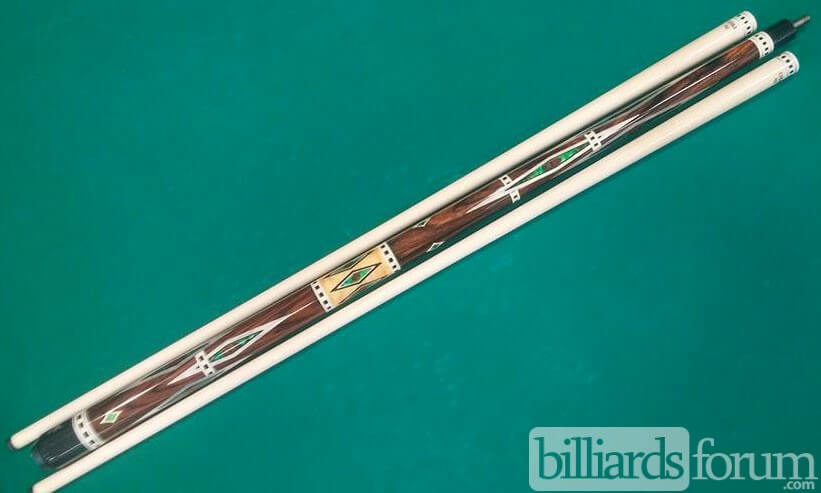 Photo of a Cocobolo BMC Diamond pool cue numbered #2/50 on the forearm.