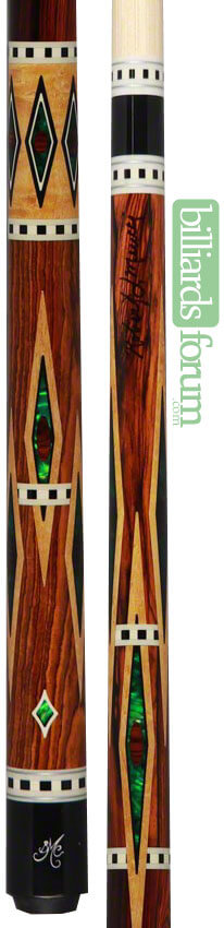 The Meucci Diamond Cue made from Cocobolo wood and inlaid with 60 diamonds of various high-quality materials. It starts with authentic Birdseye maple on the outside of all diamonds, Green Pearl centers with genuine Cocobolo shell ovals. The Meucci Diamond Cue has eight sets of black fiber trim rings that are each inlaid with 12 white squares. That is a sum of 96 mosaic squares. This Meucci Diamond Cue comes with two Black Dot Bullseye shafts, engraved numbers, and is signed and dated by Bob Meucci himself.