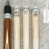 | Butt Sleeve: | The butt sleeve isn't typical in length. It is much longer. The buttsleeve contains the same, but slightly smaller, diamond and ring pattern used in the forearm. The inlays are set in cocobolo wood and features several large diamond inlays and white rings with black square inlays. Birdseye maple is used on the exterior of all diamonds. The earliest cues used mother of pearl for this, but that was swapped out for birdseye maple after Meucci noticed the MOP didn't hold up well. The ovals in the middle of the diamonds are made from authentic Abalone shell. In the case of the 6 trim diamonds, the Abalone used is a very rare "Heart of Abalone". |