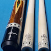 | Forearm: | The forearm is set in beautiful dark cocobolo wood and features several large diamond inlays and black fiber rings. Birdseye maple is used on the exterior of all diamonds. The earliest cues used mother of pearl for this, but that was swapped out for birdseye maple after Meucci noticed the MOP didn't hold up well. The ovals in the middle of the diamonds are made from authentic Abalone shell. In the case of the 6 trim diamonds, the Abalone used is a very rare "Heart of Abalone". Most of the BMC Diamond cues are signed on the forearm. Some are also dated. |