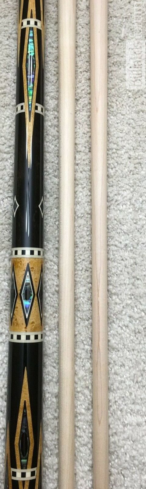 The ebony BMC Diamond cue consists of genuine gaboon ebony wood with a maple core, and is inlaid with 60 diamonds of various high-quality materials beginning with authentic African ebony on the exterior of all diamonds and cocobolo centers with authentic abalone shell ovals. In the case of the six trim diamonds, the Abalone is "Heart of Abalone" which is very rare.