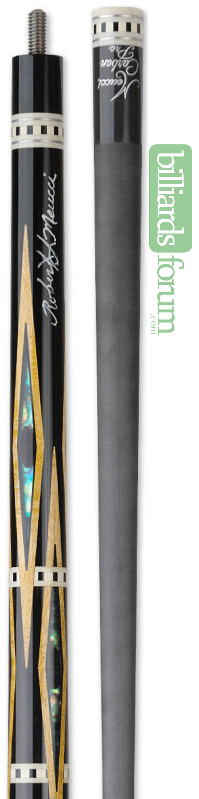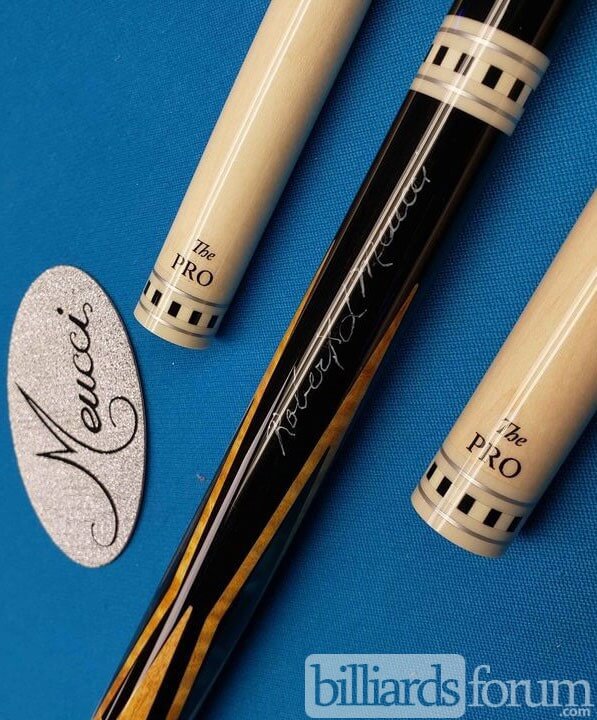 The inlay material used to border the diamonds in the initial few cues was mother-of-pearl. Apparently there was a tendency for the MOP to crack, and so now Meucci uses birdseye maple in the place of the mother-of-pearl on the newer ebony diamond cues they make. This generally means that an earlier cue with un-cracked mother-of-pearl inlays would be worth a bunch more as time goes on.
