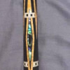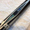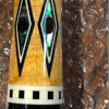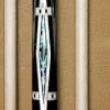 | Butt Sleeve: | The butt sleeve isn't typical in length. It is much longer. The buttsleeve contains the same, but slightly smaller, diamond and ring pattern used in the forearm. The inlays are set in ebony wood and features several large diamond inlays and white rings with black square inlays. Birdseye maple is used on the exterior of all diamonds. The earliest cues used mother of pearl for this, but that was swapped out for birdseye maple after Meucci noticed the MOP didn't hold up well. The ovals in the middle of the diamonds are made from authentic Abalone shell. In the case of the 6 trim diamonds, the Abalone used is a very rare "Heart of Abalone". |