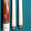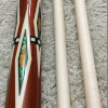 The cue consists of a beautiful piece of vermilion wood, inlaid with 60 diamonds of various high-quality materials beginning with ivory colored material and maple on the exterior of all diamonds and BEM centers. The six trim diamonds are abalone "Heart of Abalone" which is very rare.