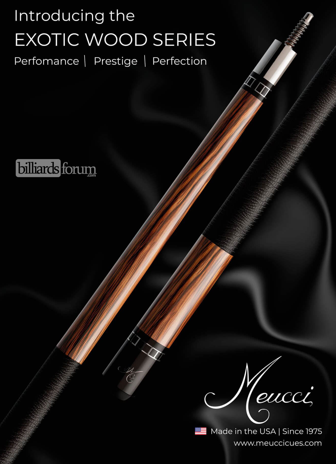 Meucci debuted its Exotic Wood series pool cues at the February 2024 CSI Expo. It can be seen near the end of this short video of the Meucci booth, with it's flyer laying beside it.