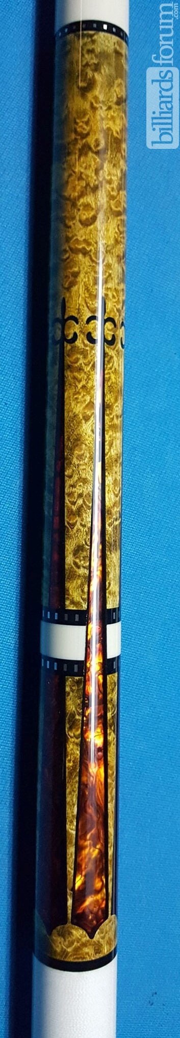An early (2018) version of the BMC Golden Knight cue. It isn't numbered, and has a black trim outlining the paua shell inlays in the forearm and buttsleeve (instead of the usual white). The black was common in the design when it was part of the Meucci-branded Mary Avina line.